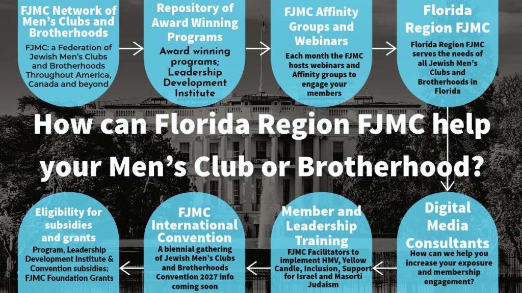 FJMC International is a confederation of over 200 Jewish Men’s Clubs and Brotherhoods representing members throughout the United States, Canada, Latin America, and beyond. Learn how YOUR Men’s Club or Brotherhood can affiliate with the FJMC at: https://fjmc.org/for-clubs/affiliating-with-the-fjmc/.