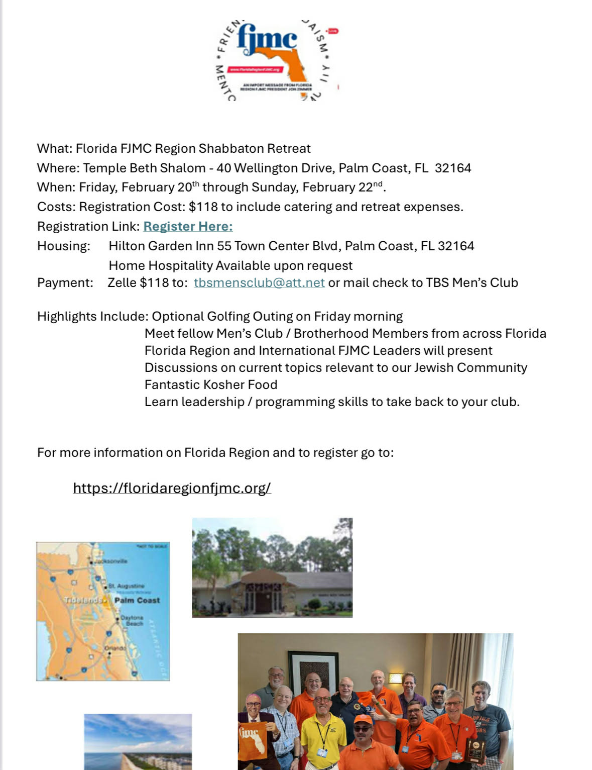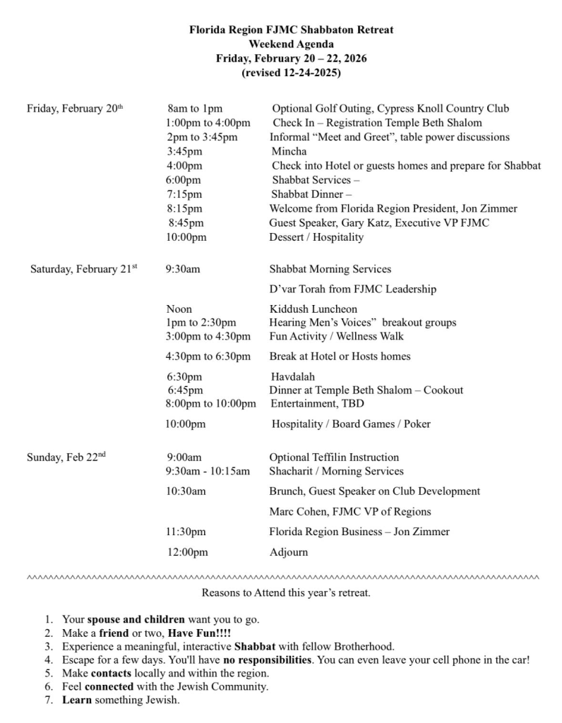 The Florida Region FJMC 2026 Shabbaton Retreat will be live and in person – February 20 to 22, 2026, centrally located at Temple Beth Shalom, 40 Wellington Drive, Palm Coast, FL 32164 and the nearby Hilton Garden Inn, 55 Town Center Blvd, Palm Coast, FL 32164.