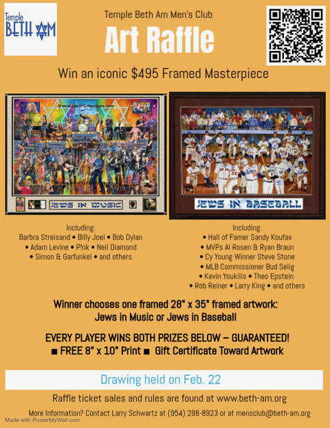Save the Date: February 22, 2026 for the Temple Beth Am Men’s Club Art Raffle where Men’s Club is giving you a chance to win a framed masterpiece valued at $495 by buying ticket(s) for its Jews in Music or Baseball raffle. Proceeds of the raffle support the Men’s Club and Temple Beth Am. The raffle winner can choose a 28″ x 35″ framed picture of either Jews in Baseball or Jews in Music. With every ticket purchase, you will receive the following prizes just for playing, a FREE 8” x 10” Print of Jews in Baseball and a Gift Certificate toward the purchase of either pieces of artwork. The drawing will be held on February 22 (*) and the winner will be announced at the Men’s Club Baseball Movie Night. You do not need to be present to win the raffle. These pieces of artwork are created and sold through www.jewishcollections.com. You are invited to go to: Jews in Music or Baseball Raffle – Form – Temple Beth Am for more information about these pieces.