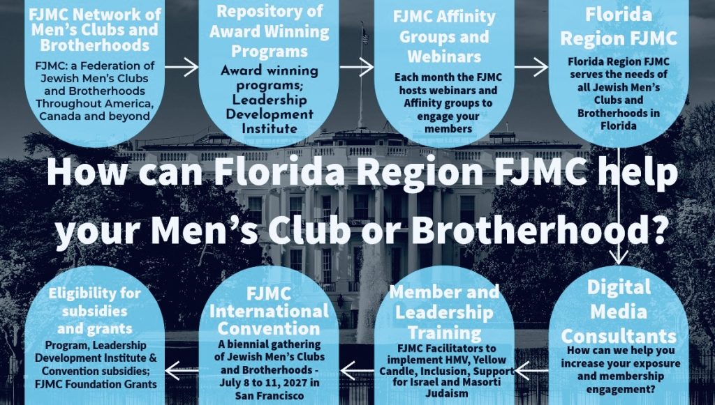 FJMC International is a confederation of over 200 Jewish Men’s Clubs and Brotherhoods representing members throughout the United States, Canada, Latin America, and beyond. Learn how YOUR Men’s Club or Brotherhood can affiliate with the FJMC at: https://fjmc.org/for-clubs/affiliating-with-the-fjmc/.